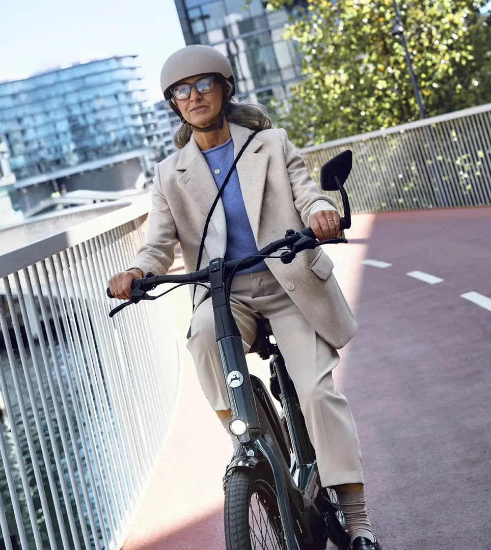 Volkomen ontspannen fietsen begint met gemakkelijk opstappen. Daarvoor is de ruime, lage instap bedoeld. Wanneer je op het zadel zit, kan je alsnog altijd je voeten op de grond zetten. Om vanuit een comfortabele zitpositie - rechtop - te gaan fietsen. De krachtige motor springt direct bij wanneer je wegfietst. Tip je de remmen aan, dan sta je snel en veilig stil: met beide benen op de grond.
